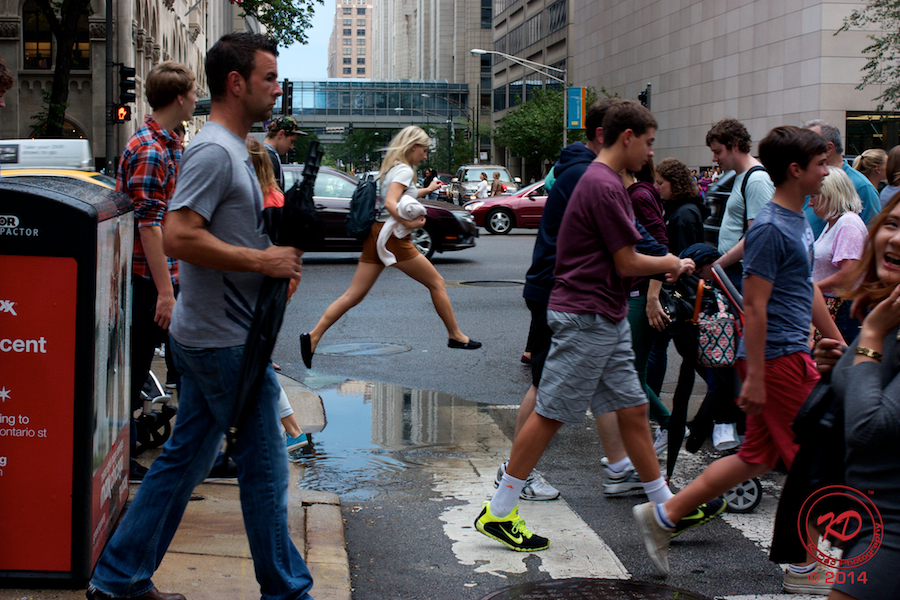 Afterwards, I returned to downtown around Michigan Avenue and took advantage of the scene of people walking around in the rain. While still fumbling with an umbrella in one hand and camera in the other, I wandered up and down the street looking for interesting subjects, keeping in mind Mr. White’s “three f-words”: faith, focus, and flight. As usual, the people of this great city never disappoints.